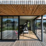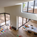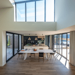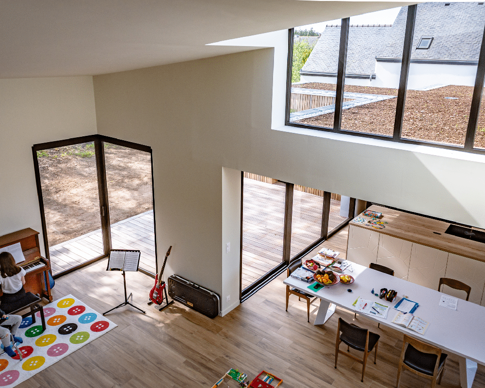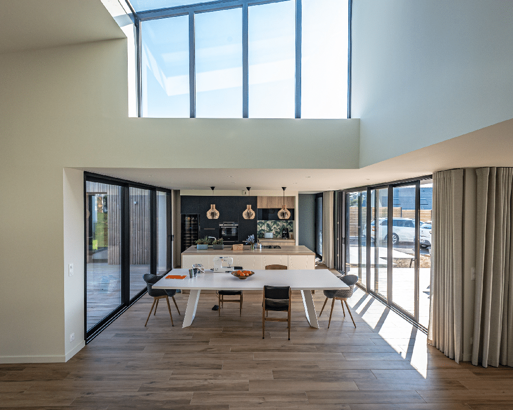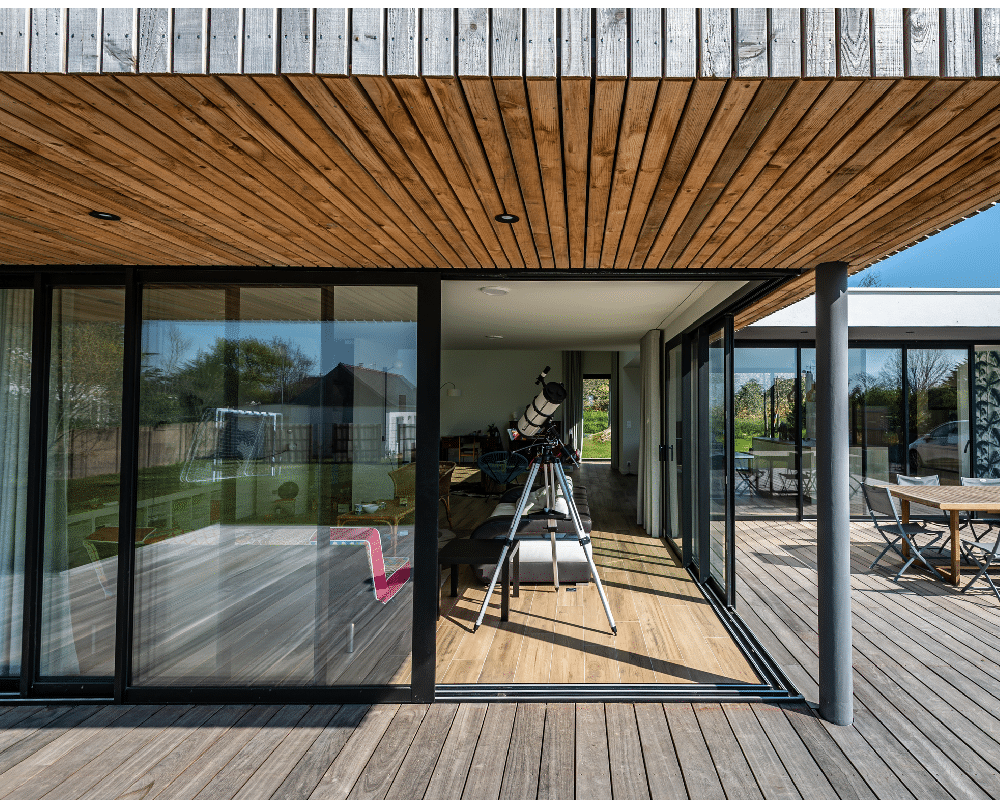 Ce chantier montre le savoir-faire de l’entreprise avec différentes déclinaisons de châssis coulissants : coulissant d’angle, coulissant d’angle à galandage, coulissant 3 vantaux grandes dimensions mais également une verrière composée en toiture.